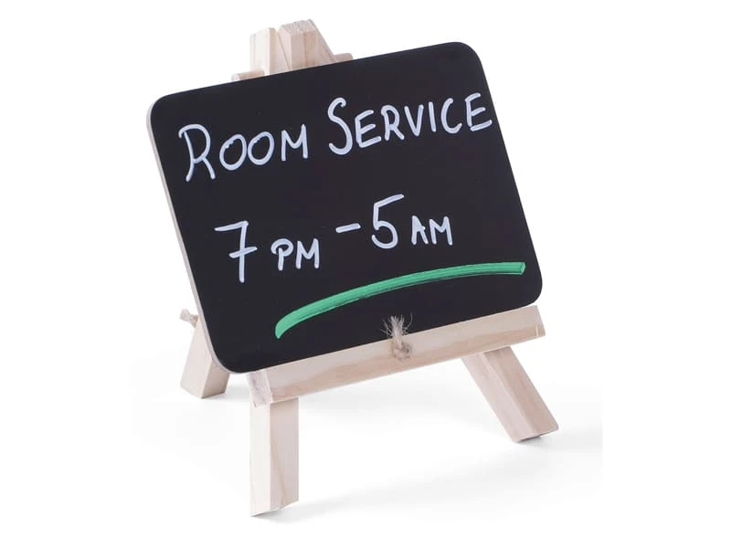 Ardoise de table noire avec chevalet en bois.
