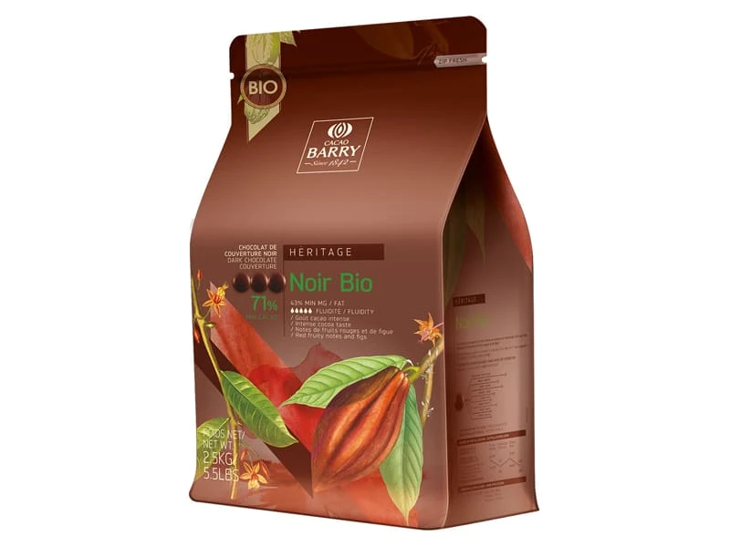 - Ingrédients : pâte de cacao bio 65%, sucre de canne bio 25,5%, beurre de cacao bio 9,5%.