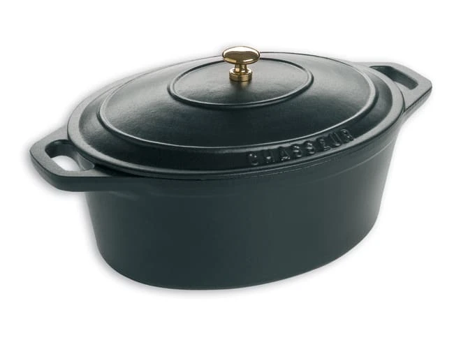 Cocotte ovale en fonte noire émaillée « Le Chasseur ».