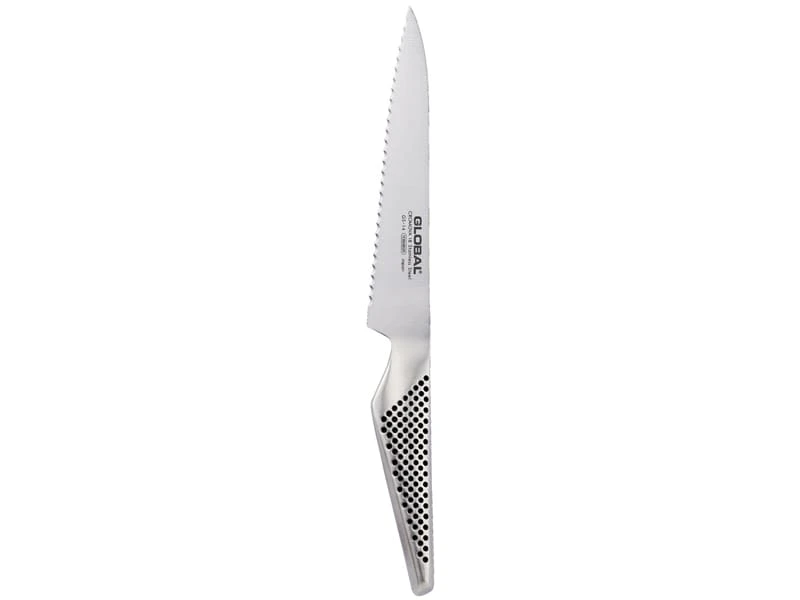 Couteau de cuisine à lame crantée en acier inoxydable. Il est étudié pour assurer un équilibre parfait dans la main. Ces contours lisses et sa fabrication « monobloc » offre le nec plus ultra dans la sécurité et l’hygiène.