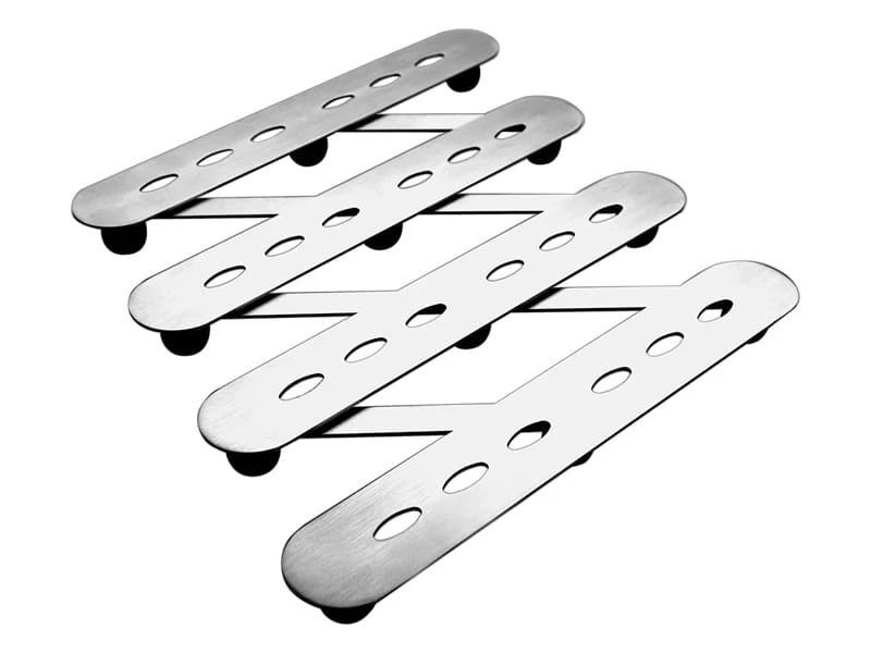 Ce dessous de plat en inox est extensible jusqu’à 45 cm.