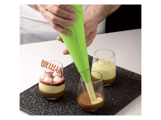 Montée dans une poche, cette douille à embout long facilite le remplissage pratique des verrines sans en salir les parois.