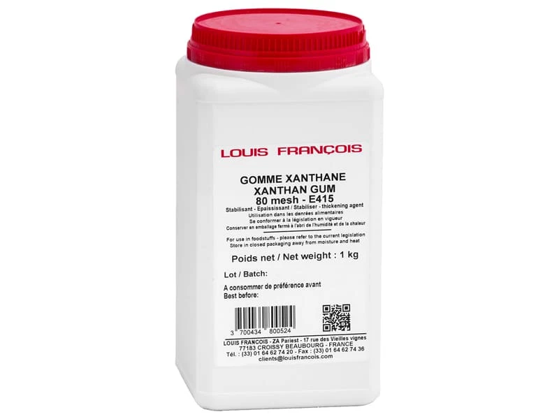 La gomme xanthane E415 est une poudre d’origine naturelle qui augmente la viscosité des produits liquides et pâteux sans les gélifier (potages, crèmes desserts, crèmes glacées, nappages pour pâtisserie).