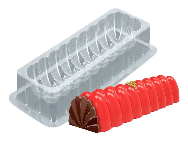 Moule thermoformé permettant la réalisation d’une bûche, d’une glace (ou bavaroise ou mousse de fruits) de forme originale.