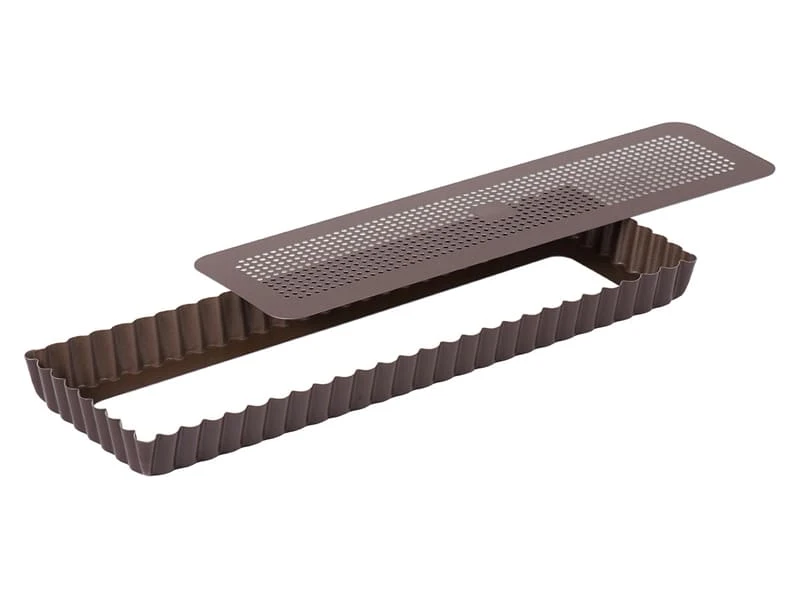 Moule à tarte rectangulaire avec fond perforé.