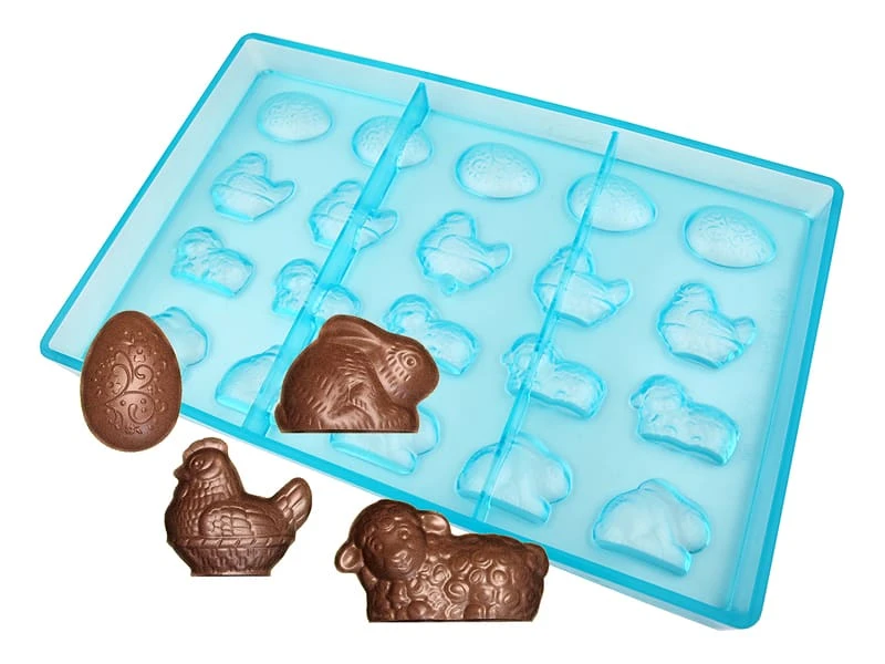 Moule en tritan comportant 20 empreintes de fritures (5 agneaux, 5 lapins, 5 poules, 5 oeufs) pour les festivités de Pâques.