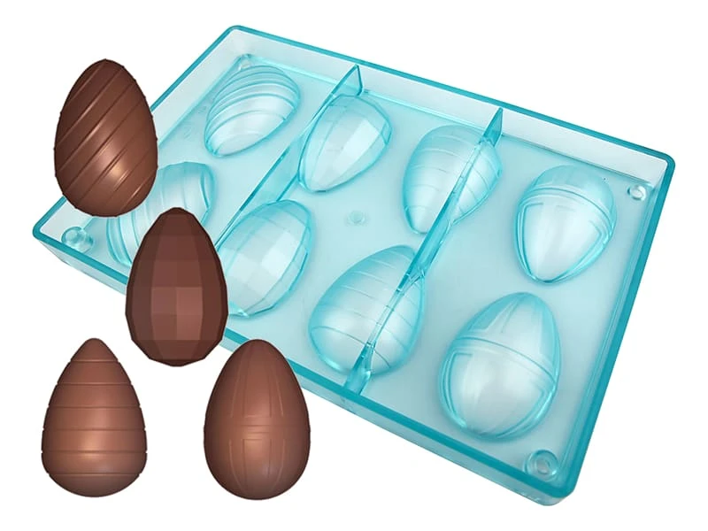Moule en tritan comportant 8 empreintes pour réaliser 4 oeufs différents aux formes géométriques.