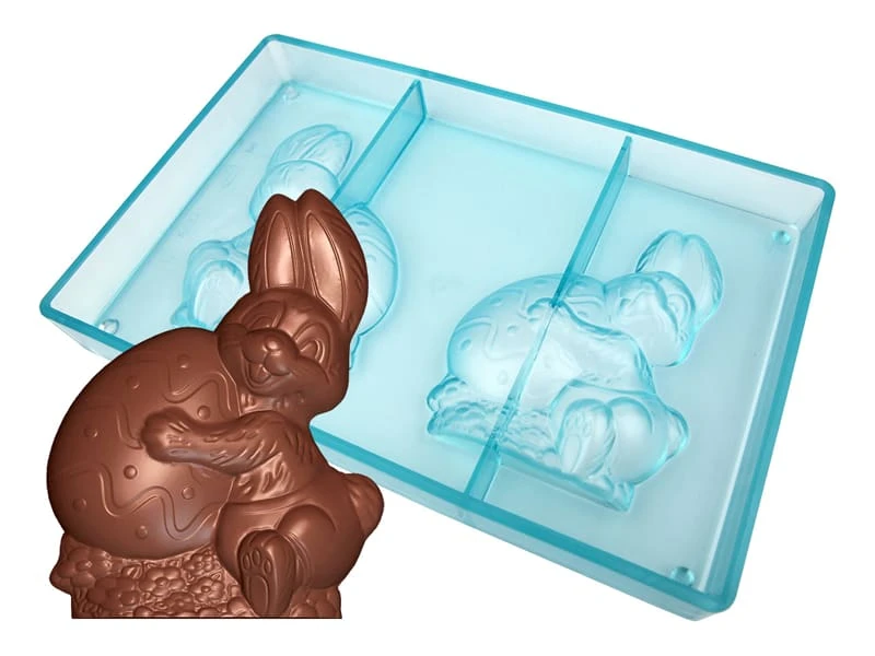 Moule en tritan comportant 2 empreintes (recto/verso) formant le moule complet du lapin tenant l’œuf.