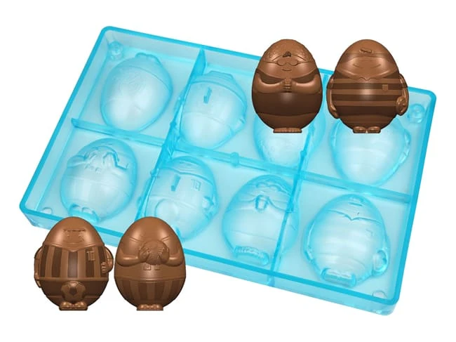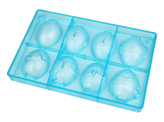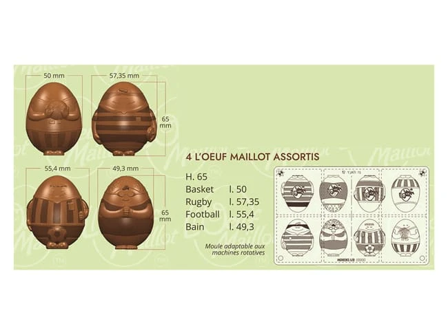 Moule en tritan comportant 8 empreintes pour réaliser 4 Oeufs « Maillots assortis » après assemblage représentant la natation, le basket, le foot et le rugby.