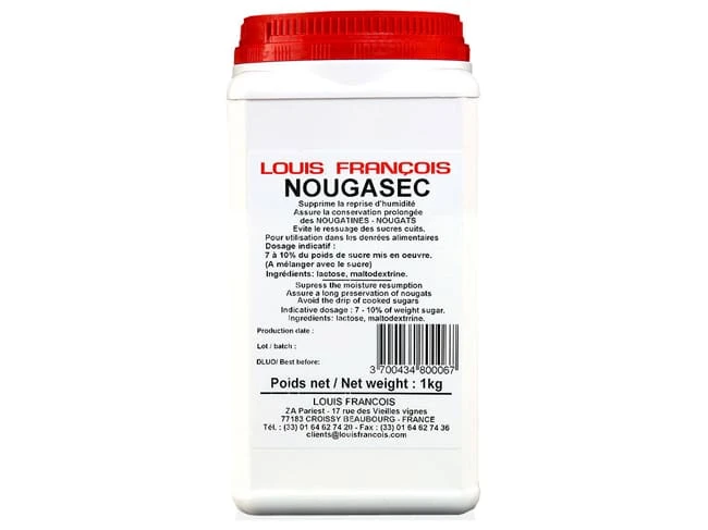 - Dosage : 7 à 10% du poids des matières sucrantes mis en œuvre (sucre, glucose, miel…). Ne rien modifier à vos formules ni à vos méthodes de travail. Incorporez simplement la dose correspondante de Nougasec en la mélangeant au sucre.