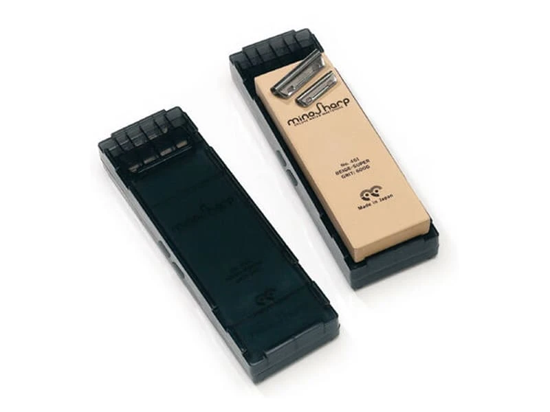 1 pierre format 210 x 70 x 22 mm, 1 jeu de 2 guides d’affûtage petit et grand modèle et une boîte plastique de rangement sui fait également office de support pour la pierre pendant l’affûtage.