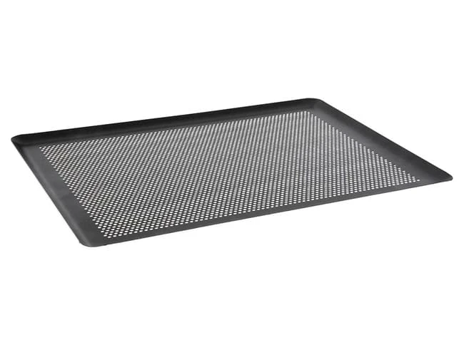 Plaque de cuisson perforée avec revêtement anti-adhérent. Bords pincés.