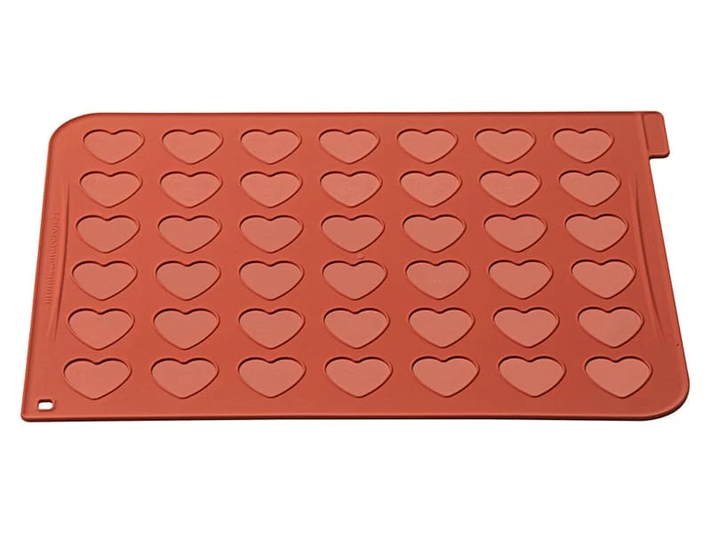 Plaque en silicone avec 42 empreintes pour confectionner des macarons en forme de cœur, bien réguliers comme chez le pâtissier.