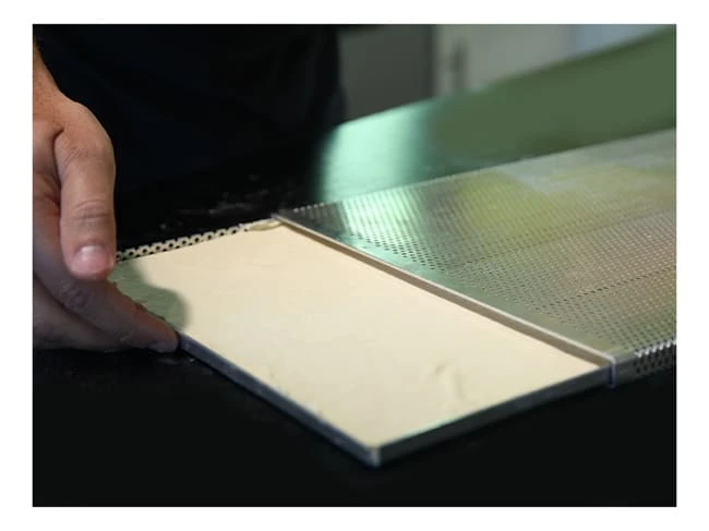 - Plaque spéciale feuilletage composée de 2 plaques coulissantes en aluminium perforé de 1,4 mm d’épaisseur.