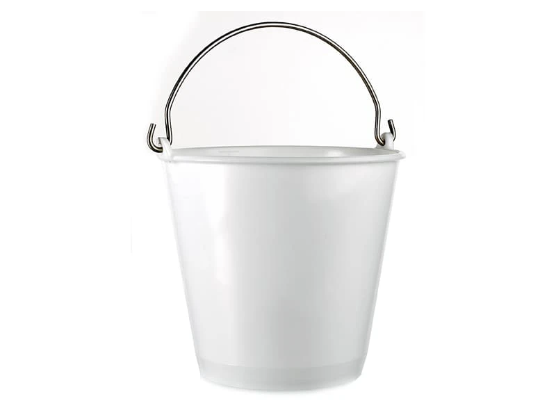 Seau rond avec anse chromée. Polyéthylène blanc, qualité non alimentaire, robuste.