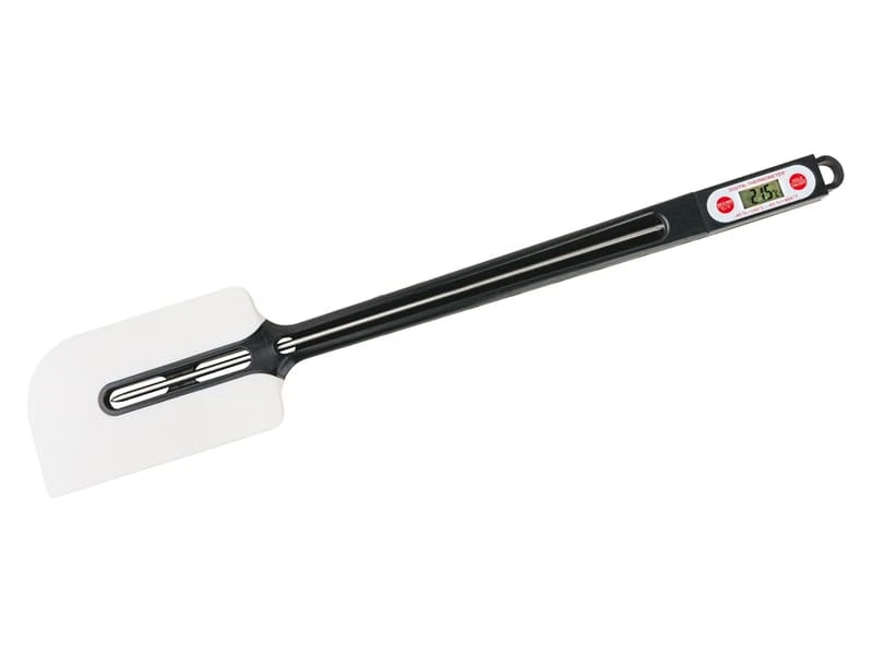 Spatule thermomètre Elvéo avec palette souple en silicone pour râcler parfaitement le fond des récipients pendant la cuisson et récupérer tout le produit en fin de travail.