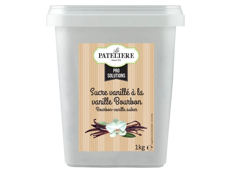 La vanille bourbon (4%) aromatise de toutes ses saveurs caractéristiques le sucre en poudre.