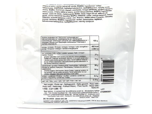 - Ingrédients : Sucre, pâte de cacao, beurre de cacao, poudre de lait entier, matière grasse laitière, arôme naturel de vanille.